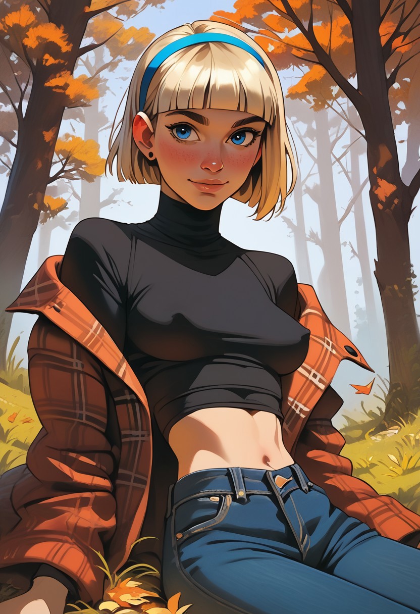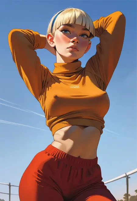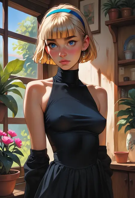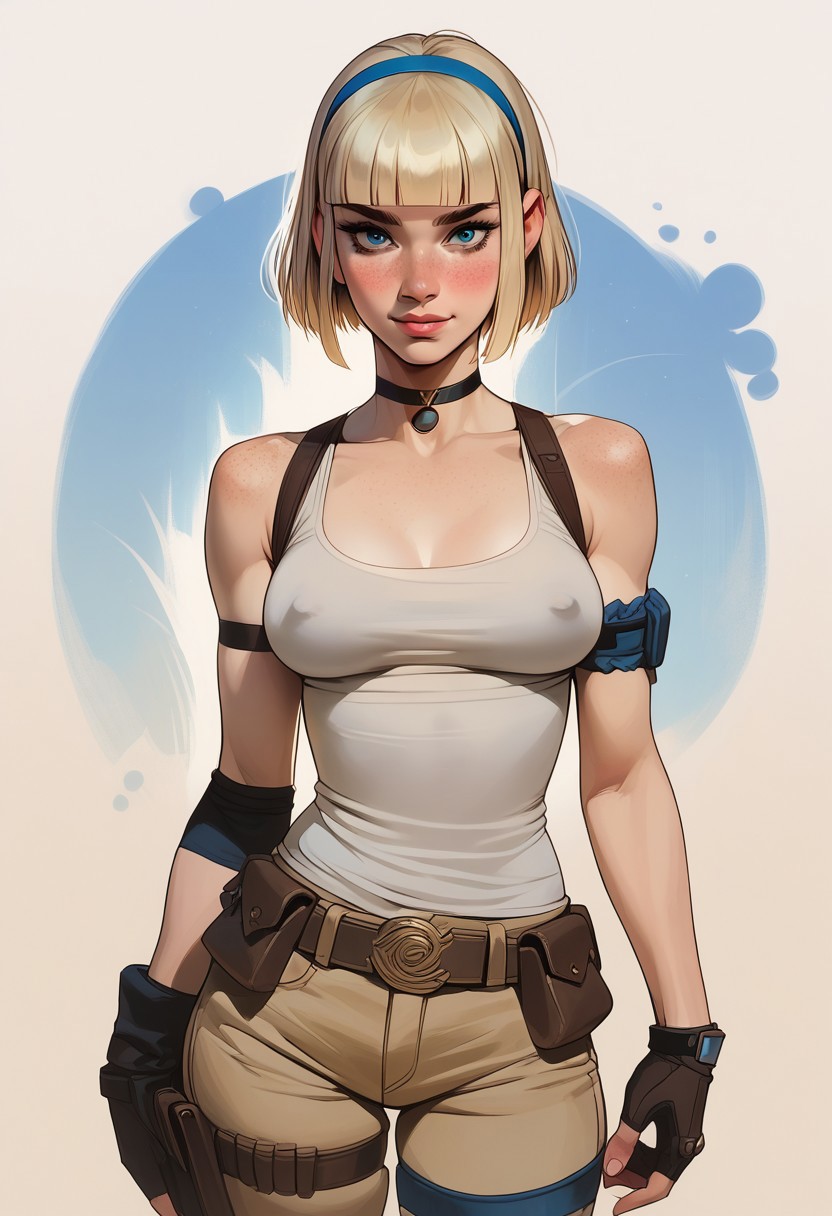 Other tags: short blonde hair, bobcut hairstyle, hairband, large perky breasts, slender, wide hips