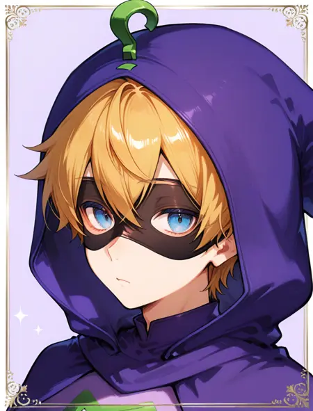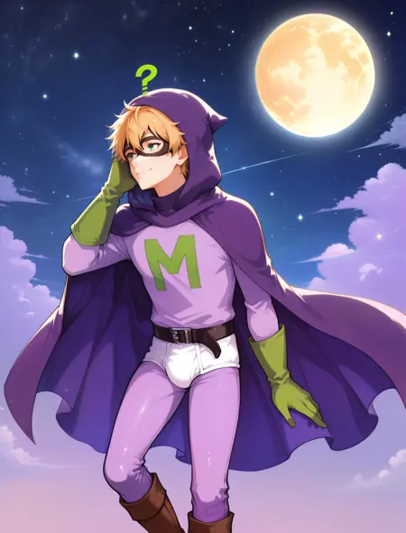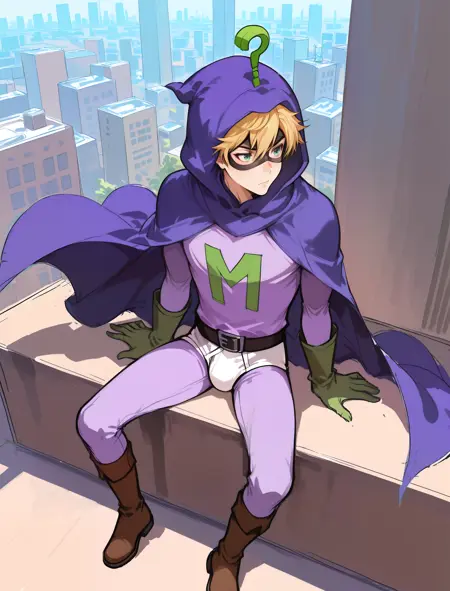 hood up, purple cloak, purple shirt, purple pants, white underwear over pants, belt, mask, green gloves