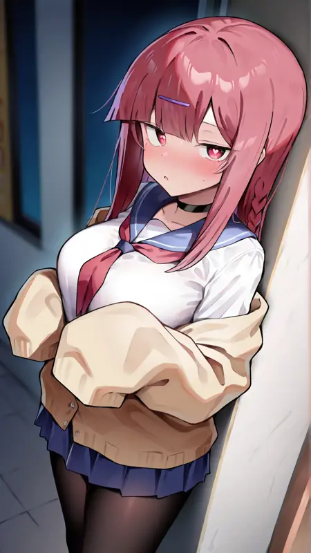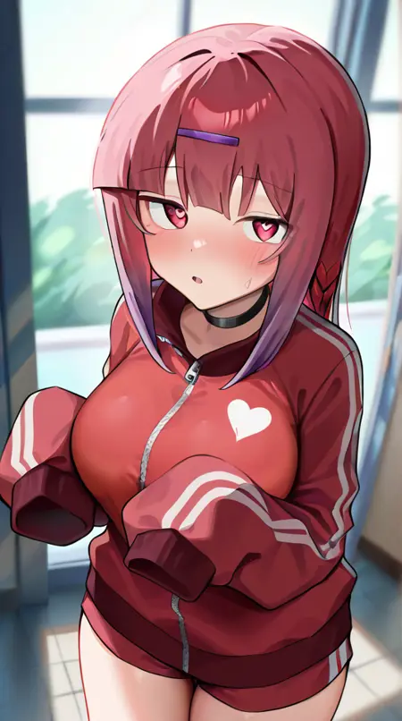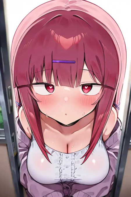 Base: red eyes, red hair, purple hair clip, choker, heart-shaped pupils, teen, large breasts
