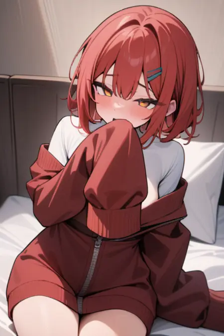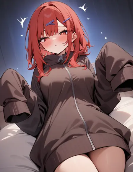 기본: 빨간 눈, 빨간 머리, 보라색 머리핀, 초크, 심장 모양의 동공, 청소년, 큰 가슴