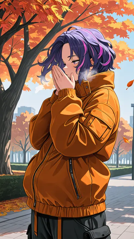 short hair, purple hair, purple eyes, streaked hair, purple dress, sleeveless, red belt, black pants, white boots