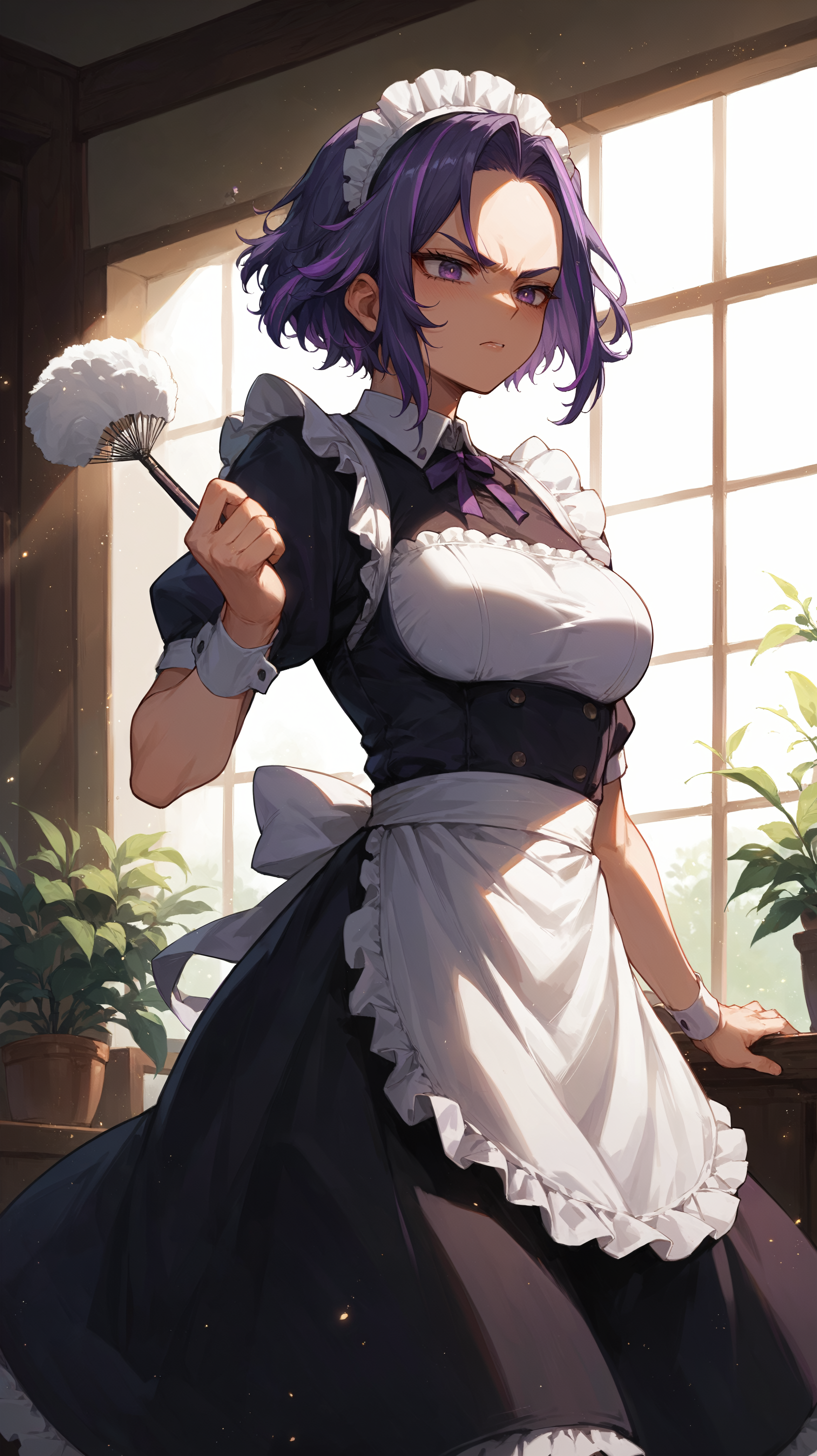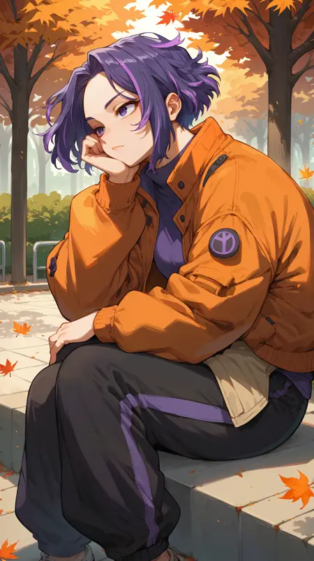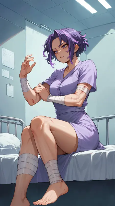short hair, purple hair, purple eyes, streaked hair, purple dress, sleeveless, red belt, black pants, white boots