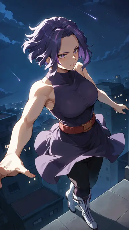 short hair, purple hair, purple eyes, streaked hair, purple dress, sleeveless, red belt, black pants, pants under dress, white boots,