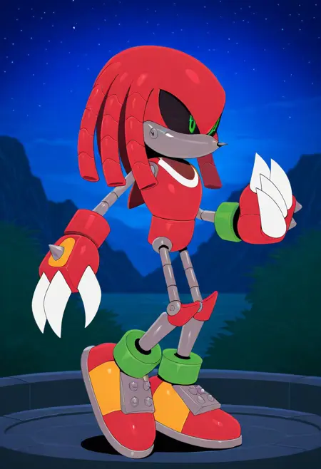 Prompt: Metal Knuckles, red robot, red skin, black sclera, green pupils, red ellipsoid torso, white rim on its chest, metal dreadlocks, sharp gray claws, red shoes