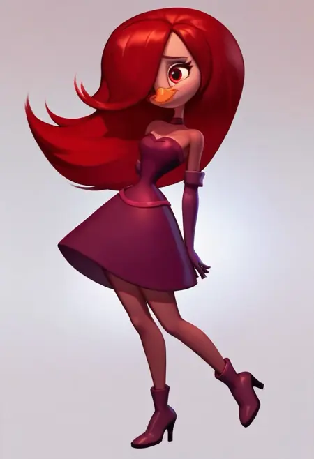 abby, duck, light skin, orange beak, long hair, red eyes, eyelashes, red hair, purple dress, strapless dress, cleavage, purple elbow gloves, boots, red theme, hair over one eye,