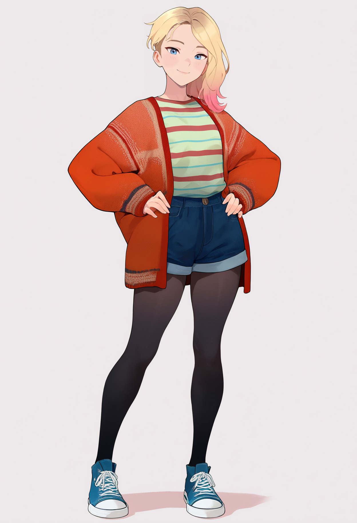 캐주얼 옷차림 프롬프트: cardigan, long sleeves, striped shirt, denim short shorts, pantyhose under shorts, blue sneakers