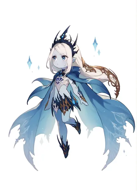 monster girl, solo, xvishiva, 色付き肌, 白髪, 青目, 角, 冠, レースのマント
