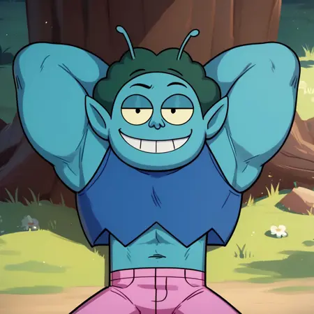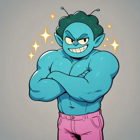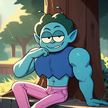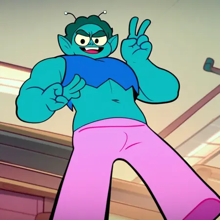トリガーワード: Rad, Radicles_X、シアン色の肌、ターコイズ色の縮れ髪、とがった耳、アンテナ、ブルーの短めのタンクトップ、ピンクのズボン、ブラックのブーツ