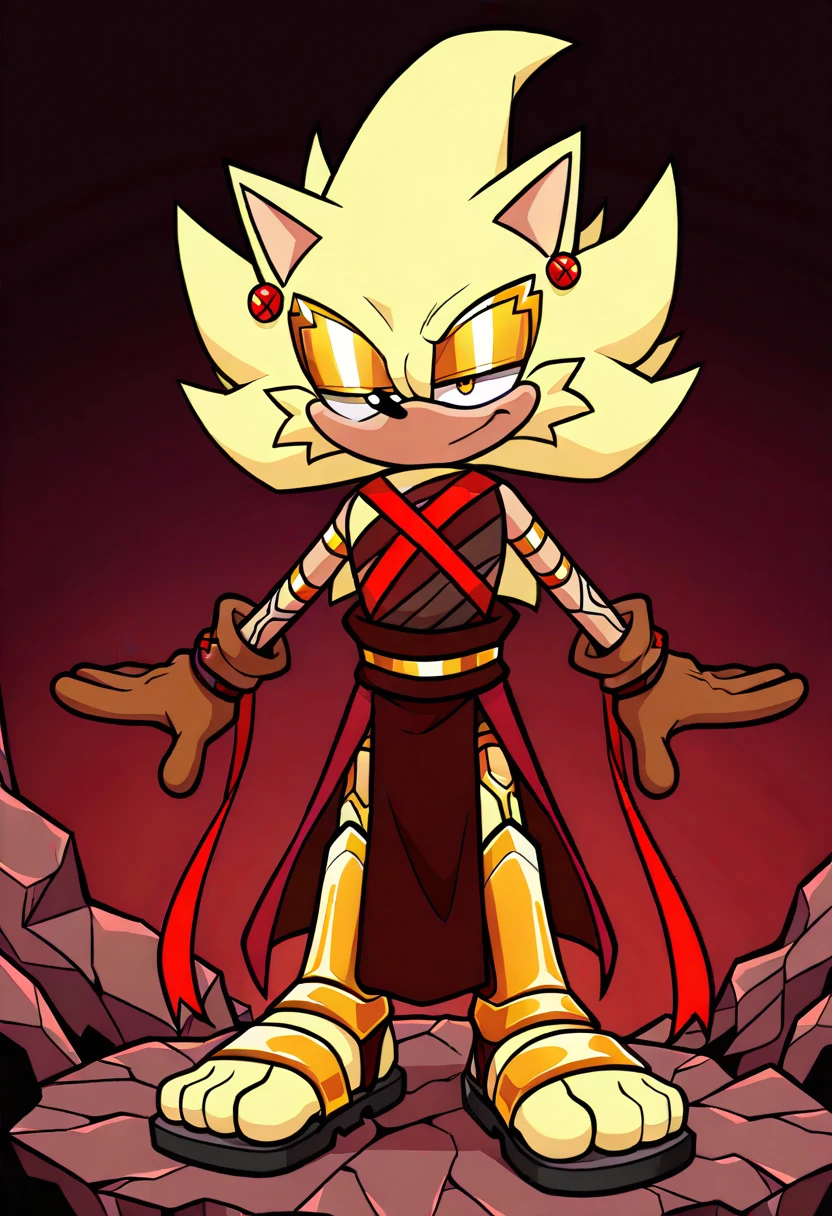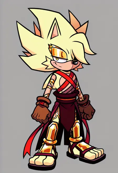 YokuboEXE, 1boy, sly pale yellow hedgehog, shiny gold vein-like cracks all over legs and body, gold eyeshadow, gold eyes, brown and red bands X over chest, dark maroon cloth on waist, brown gloves with red X buttons, maroon ribbons, gold-accented sandals,