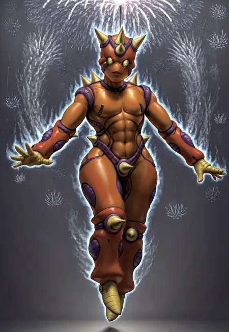 Tags: ballroomblitz, solo, full body, stand (jojo), 1boy, colored skin, yellow eyes, no pupils, spikes, robot, joints, no humans