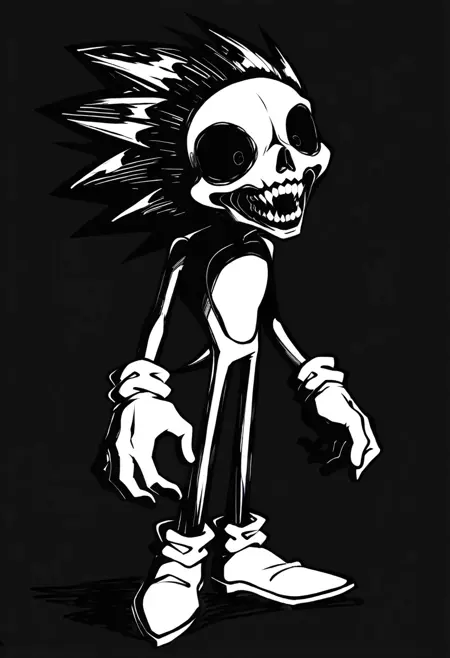 NMIEXE, 1boy, black and white version of Sonic, shadowed human-like face, human-like teeth, face covered in shadow. Black and white, monochrome, hollow eyes, black sclera, colored sclera, horror