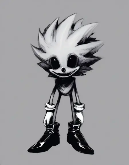 No_More_InnocenceEXE, 1boy, monochrome, greyscale, horror (theme), sonic the hedgehog, eerie, skeletal creature, spiky head, sinister, horror, white gloves, black shoes, tall, small hollow black eyes, two tone fur