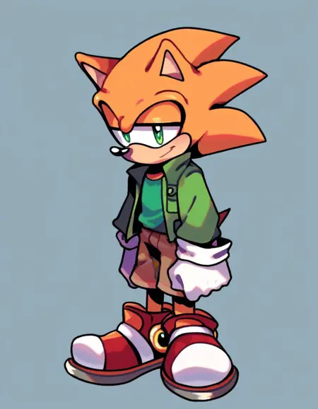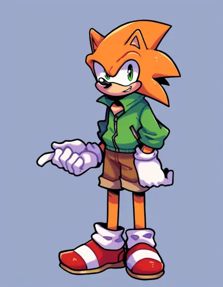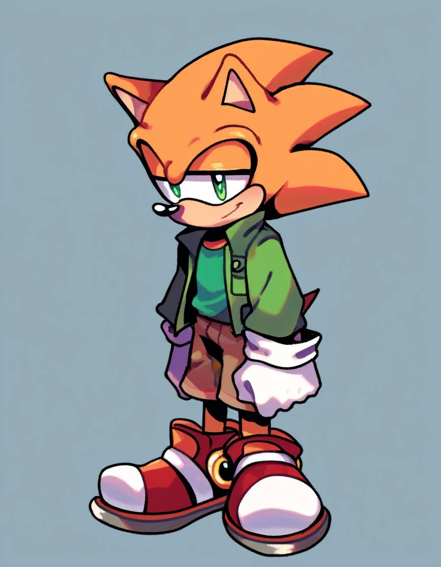 Hedgehog_PicoFNF, gloves, 1boy, animal ears, tail, furry, furry male, sonic the hedgehog, orange fur, anthropomorphic, spiky hair, green jacket, brown shorts, red shoes, green shirt, black eyes,
