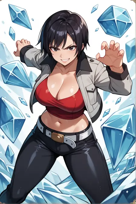 UrDefault,灰色夹克,露胸,敞开衣物,红衬衫,敞开夹克,长袖,短款夹克,黑裤,腰带,露腹UrBikini,泳装,绿色比基尼,无吊带,露出肩膀