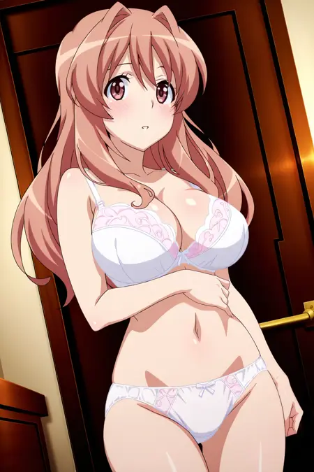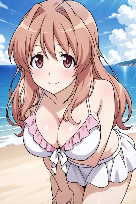 koumi haruka, 1girl, solo, brown hair, long hair, hair intakes, brown eyes, large breasts, bikini, white bikini, frilled bikini, bikini skirt, front-tie top