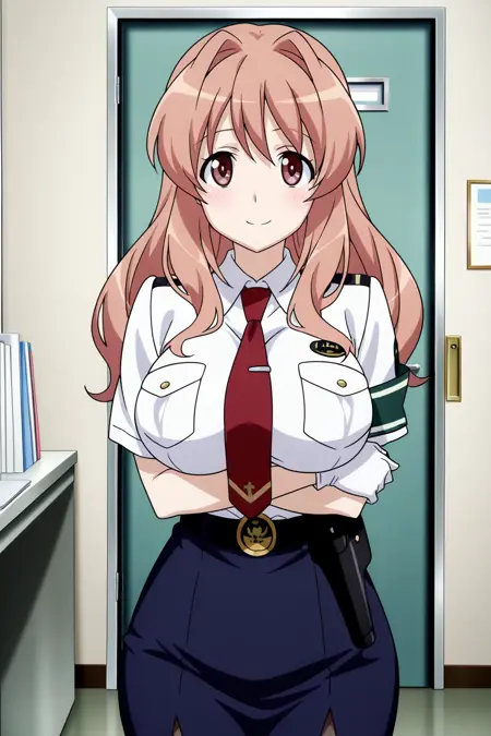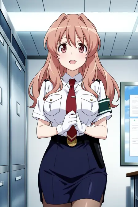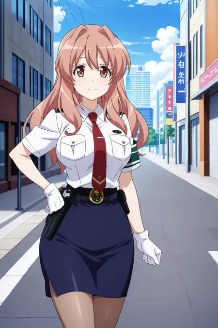 koumi haruka, 1girl, solo, brown hair, long hair, hair intakes, brown eyes, large breasts, police uniform, white shirt, collared shirt, short sleeves, red necktie, white gloves, black belt, green armband, blue skirt, pencil skirt, brown pantyhose, holster