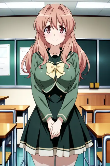 koumi haruka, 1girl, solo, brown hair, long hair, hair intakes, brown eyes, large breasts, school uniform, serafuku, green jacket, cropped jacket, green dress, pinafore dress, pleated dress, green sailor collar, sailor dress, yellow bow, yellow bowtie