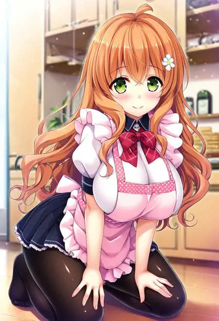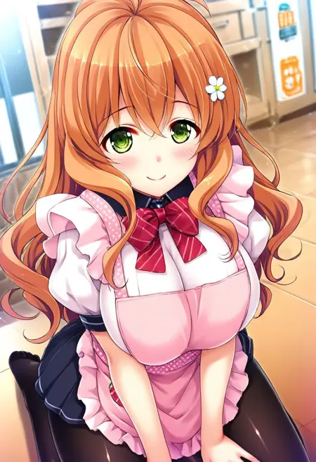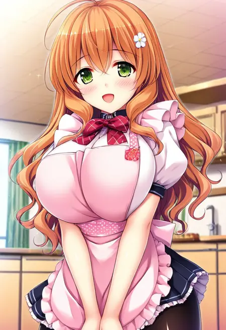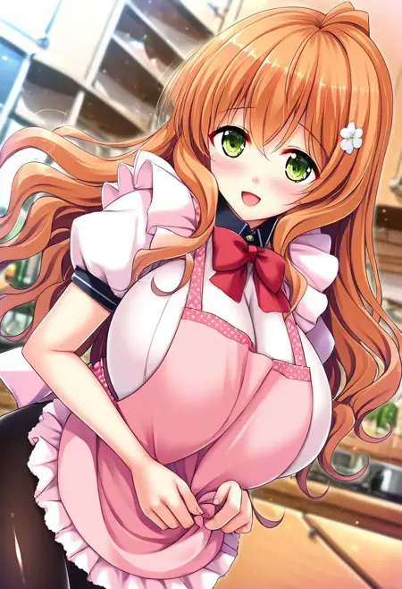服装2:粉色围裙、全围裙、红色蝴蝶结、校服、衬衫、蓬松袖子、短袖、百褶迷你裙、迷你裙、黑色丝袜、白衬衫、白色袖子