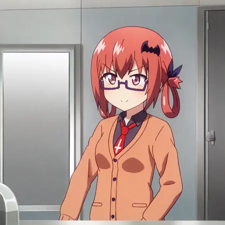 Trigger with glasses: SatanichiaGlasses, 1girl, satanichia kurumizawa mcdowell, bat hair ornament, glasses, red necktie, red hair, inverted cross, cardigan, school uniform, black shirt, hair rings, bespectacled, collared shirt, purple-framed eyewear, purple eyes, hair ribbon, cowboy shot