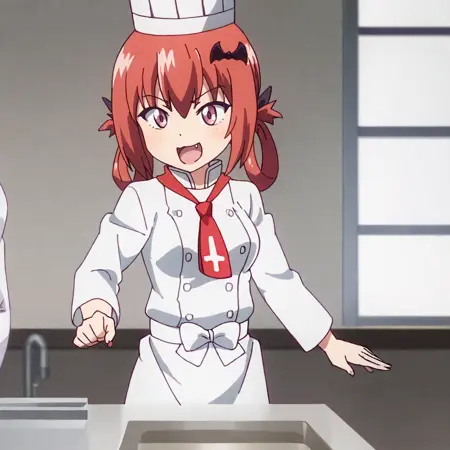 Trigger with chef outfit: SatanichiaChef, chef hat, satanichia kurumizawa mcdowell, 1girl, bat hair ornament, fang, red hair, hair rings, cross print, white headwear, ribbon, long sleeves, apron, double-breasted, pink eyes, buttons, cowboy shot