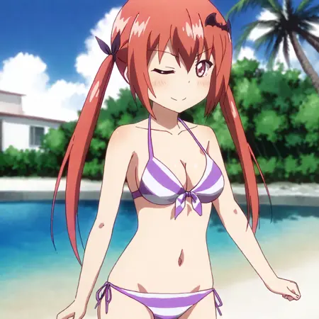 Trigger with bikini: SatanichiaBikini, 1girl, satanichia kurumizawa mcdowell, swimsuit, striped bikini, bat hair ornament, medium breasts, red hair, side-tie bikini bottom, twintails, navel, long hair, purple bikini, cleavage, red eyes, collarbone, front-tie top, halterneck, hair ribbon cowboy shot
