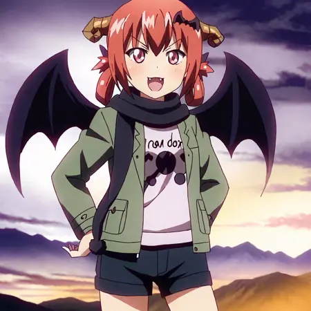 Trigger with devil winter outfit: SatanichiaWinter, 1girl, satanichia kurumizawa mcdowell, demon horns, scarf, hair rings, shorts, bat hair ornament, red hair, fang, wings, print shirt, jacket, red eyes, demon girl, open clothes, cowboy shot