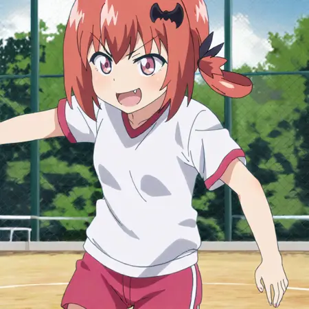Trigger with sports outfit: SatanichiaSports, satanichia kurumizawa mcdowell, bat hair ornament, 1girl, fang, red hair, gym uniform, white shirt, shorts, pink eyes, cowboy shot
