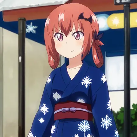 Trigger with kimino: SatanichiaMisc, satanichia kurumizawa mcdowell, 1girl, bat hair ornament, blue kimono, japanese clothes, hair rings, red hair, purple eyes, sash, obi, yukata, snowflake print, utility pole, collarbone, >:), cowboy shot