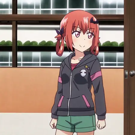 Trigger with black jacket: SatanichiaBlackJacket, 1girl, satanichia kurumizawa mcdowell, bat hair ornament, green shorts, red hair, hood, hoodie, hair rings, collarbone, jacket, shirt, long sleeves, cowboy shot