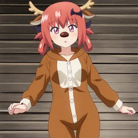 Trigger with deer costume: SatanichiaDeer, 1girl, animal costume, reindeer costume, satanichia kurumizawa mcdowell, red hair, reindeer antlers, hair ornament, hair rings, long sleeves, bangs, purple eyes, cowboy shot