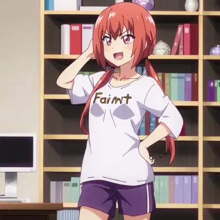 Trigger with long shirt: SatanichiaLongShirt, 1girl, red hair, fang, satanichia kurumizawa mcdowell, purple shorts, white shirt, twintails, long hair, clothes writing, shelf, collarbone, red eyes, t-shirt, cowboy shot