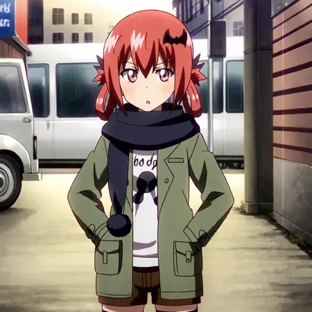 Trigger with winter outfit: SatanichiaWinter, 1girl, satanichia kurumizawa mcdowell, bat hair ornament, scarf, red hair, shorts, black thighhighs, hair rings, coat, shirt, pocket, red eyes, long sleeves, cowboy shot