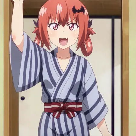 Trigger with sauna attire: SatanichiaSauna, satanichia kurumizawa mcdowell, 1girl, bat hair ornament, japanese clothes, bath yukata, red hair, collarbone, hair rings, striped kimono, fang, sash, pink eyes, cowboy shot