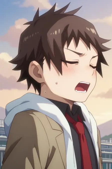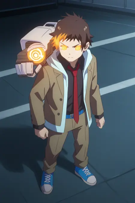 갈색 자켓, 검은 셔츠, 빨간 넥타이, 갈색 바지, 파란 신발