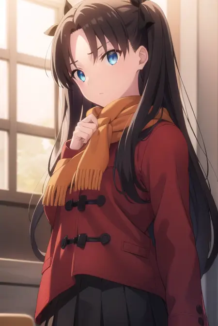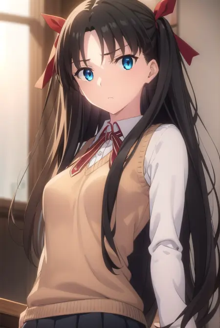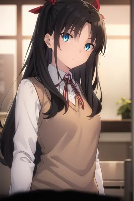 rin tohsaka, aqua eyes, black hair, hair ribbon, long hair, ribbon, sidelocks, two side up,