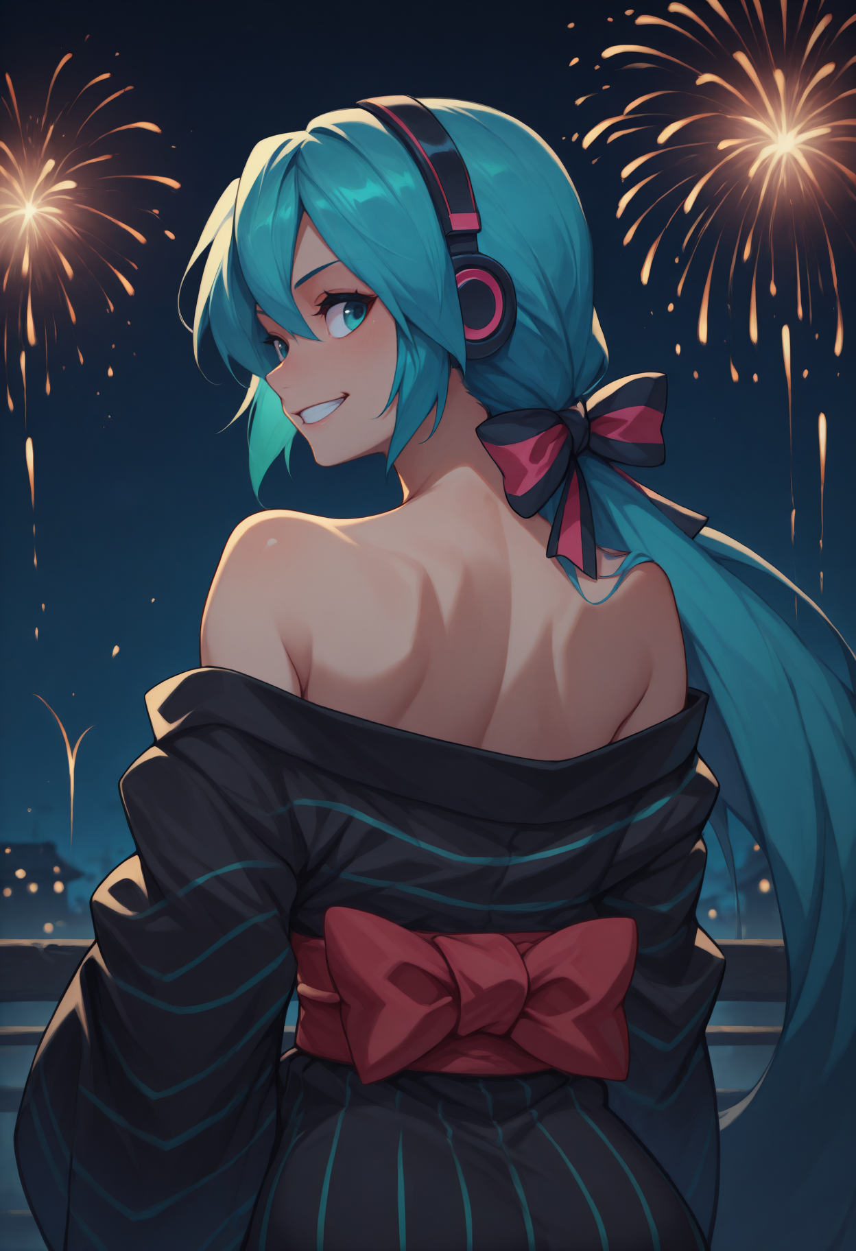 触发词 + 外观: magicianmiku, 水蓝色头发, 低马尾, 发带, 水蓝色眼睛