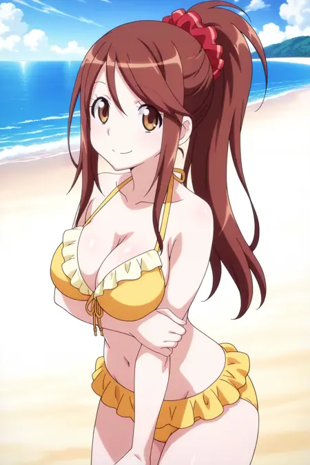 iida nana, 1girl, solo, brown hair, long hair, ponytail, hair scrunchie, red scrunchie, brown eyes, large breasts, bikini, yellow bikini, frilled bikini, front-tie top
