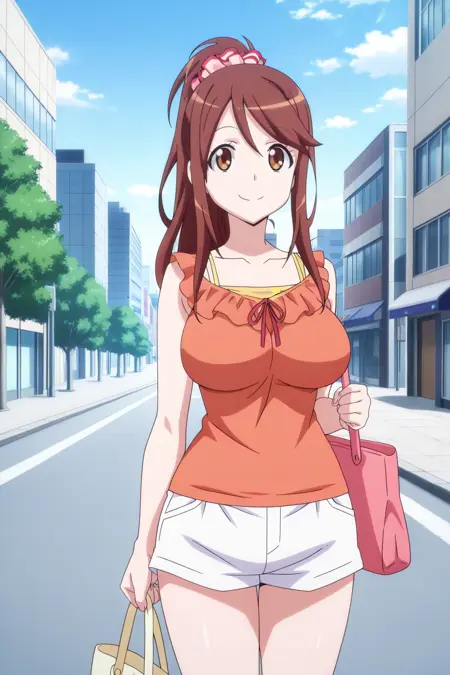 iida nana, 1girl, solo, brown hair, long hair, ponytail, hair scrunchie, pink scrunchie, brown eyes, large breasts, orange shirt, sleeveless, sleeveless shirt, frilled shirt, layered shirt, yellow camisole, white shorts, short shorts