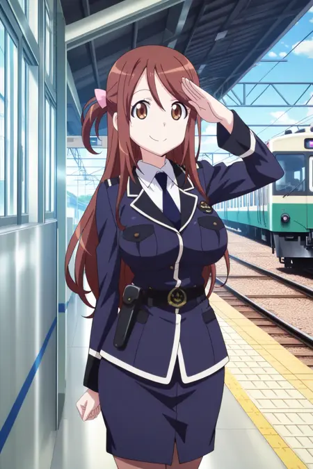 iida nana, 1girl, solo, brown hair, long hair, one side up, hair bow, pink bow, brown eyes, large breasts, police uniform, blue vest, white shirt, collared shirt, long sleeves, blue skirt, pencil skirt, blue necktie