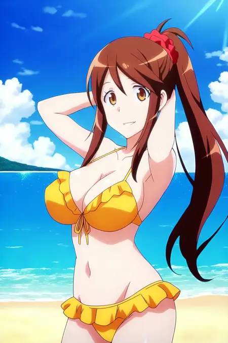 iida nana, 1girl, solo, brown hair, long hair, ponytail, hair scrunchie, red scrunchie, brown eyes, large breasts, bikini, yellow bikini, frilled bikini, front-tie top