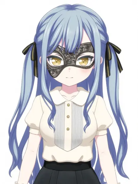 人物基础:togawa sakiko,长发,刘海,丝带,发带,黑色丝带,两侧高束,蓝发,灰发,侧发,齐刘海,黄眼