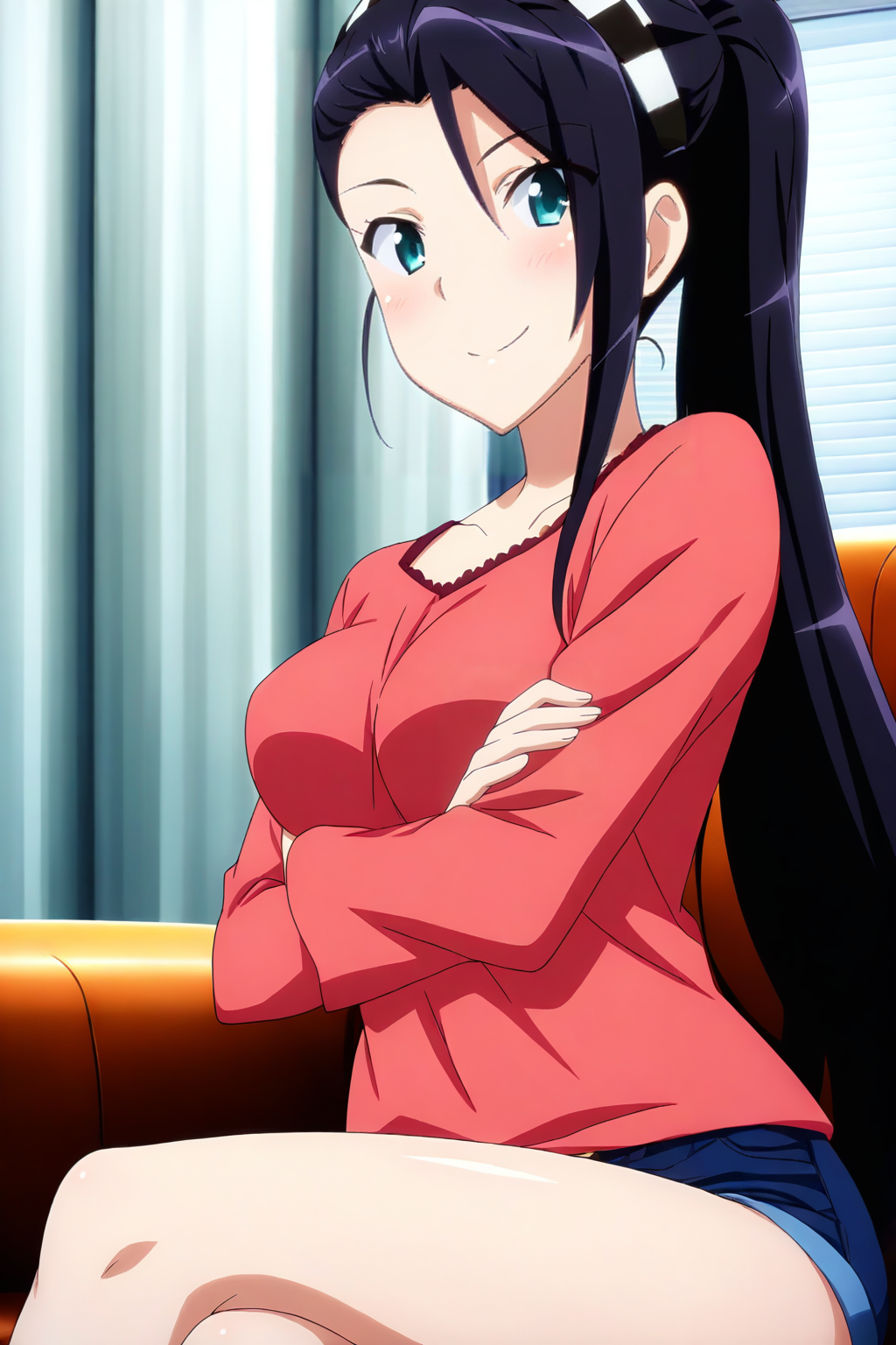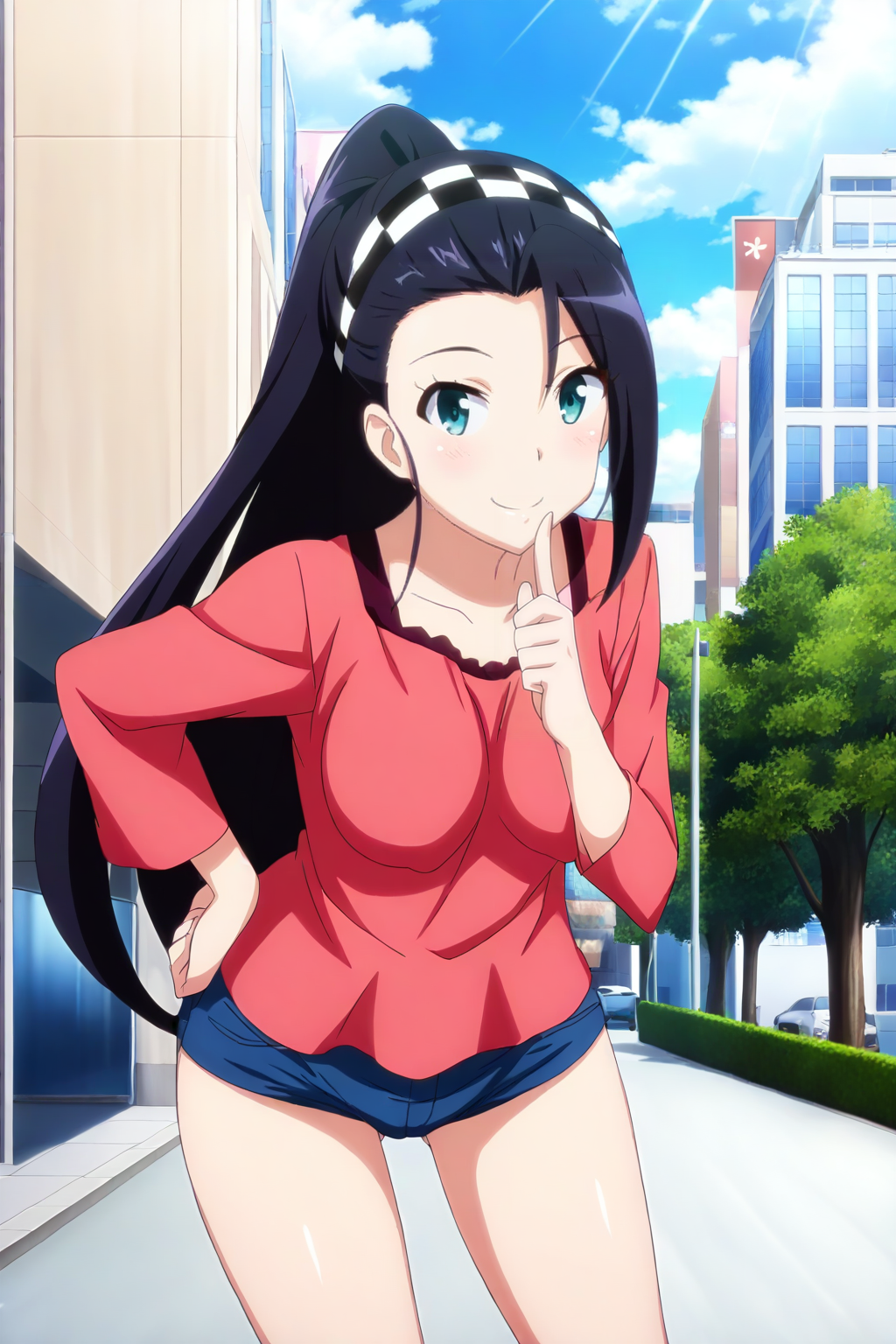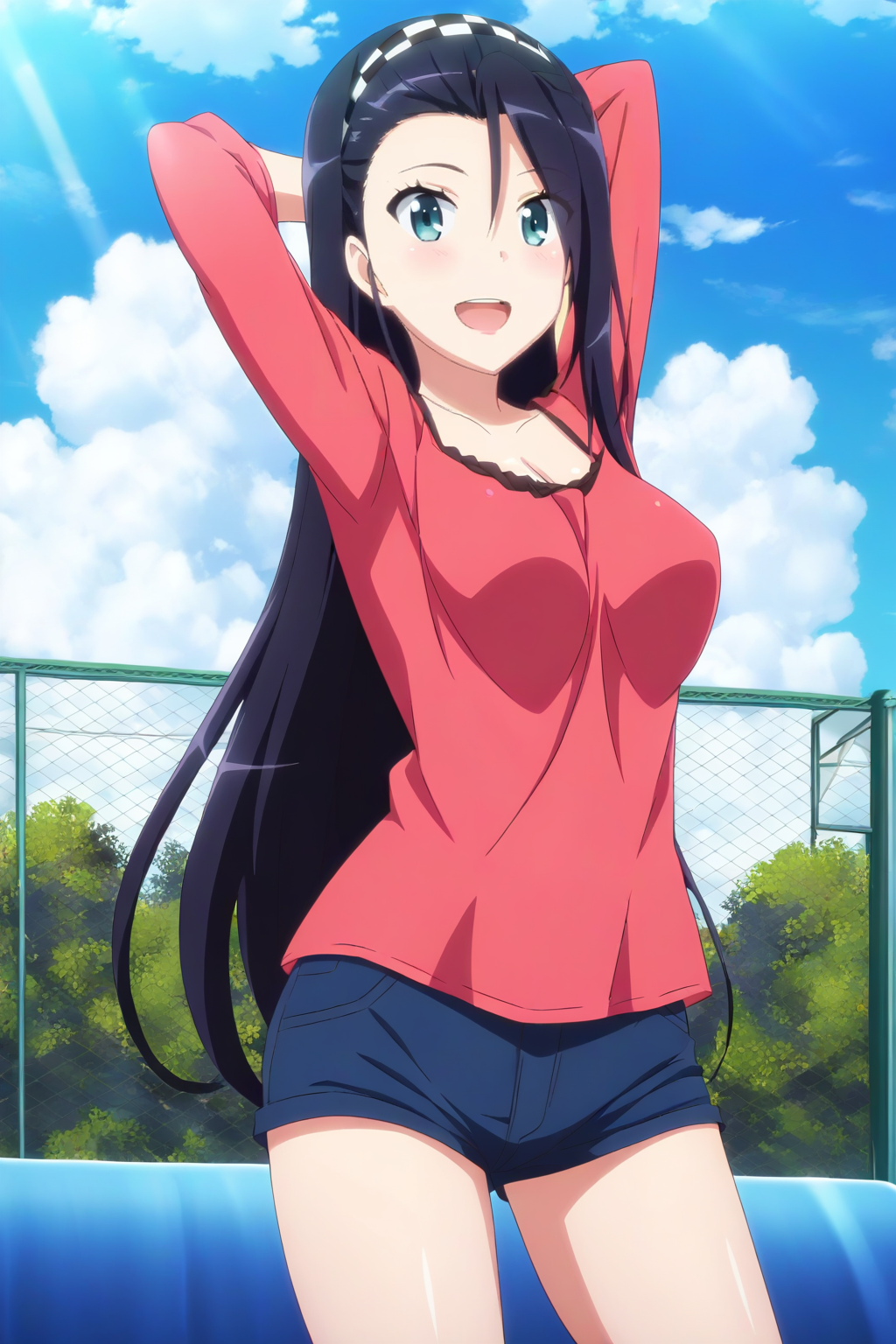 kashima noa, 1girl, solo, black hair, long hair, forehead, asymmetrical bangs, ponytail, checkered hairband, aqua eyes, medium breasts, pink shirt, red shirt, t-shirt, long sleeves, blue shorts, short shorts