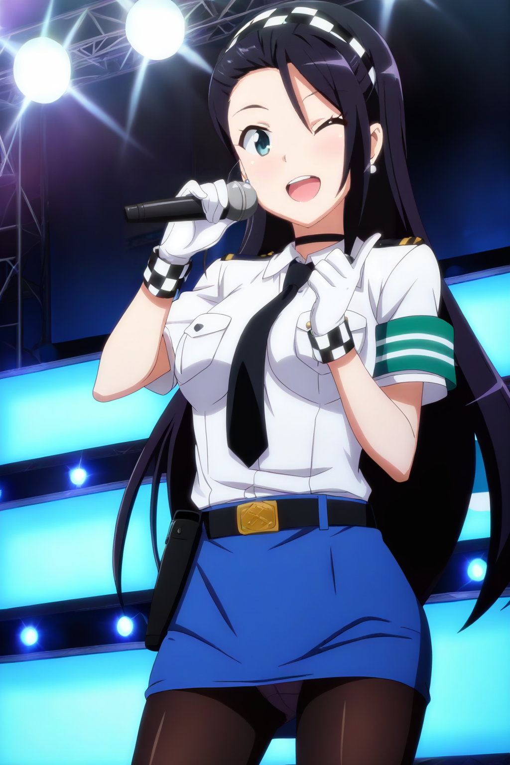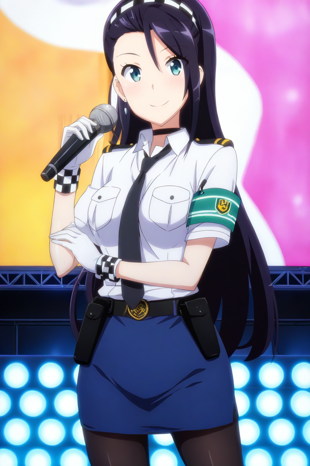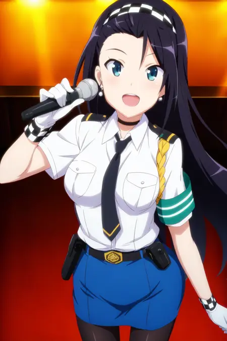 kashima noa, 1girl, solo, black hair, long hair, forehead, asymmetrical bangs, checkered hairband, aqua eyes, medium breasts, police uniform, white shirt, collared shirt, short sleeves, black necktie, black belt, blue skirt, pencil skirt, green armband, brown pantyhose, wristband, checkered wristband, white gloves, black choker, holster, earrings