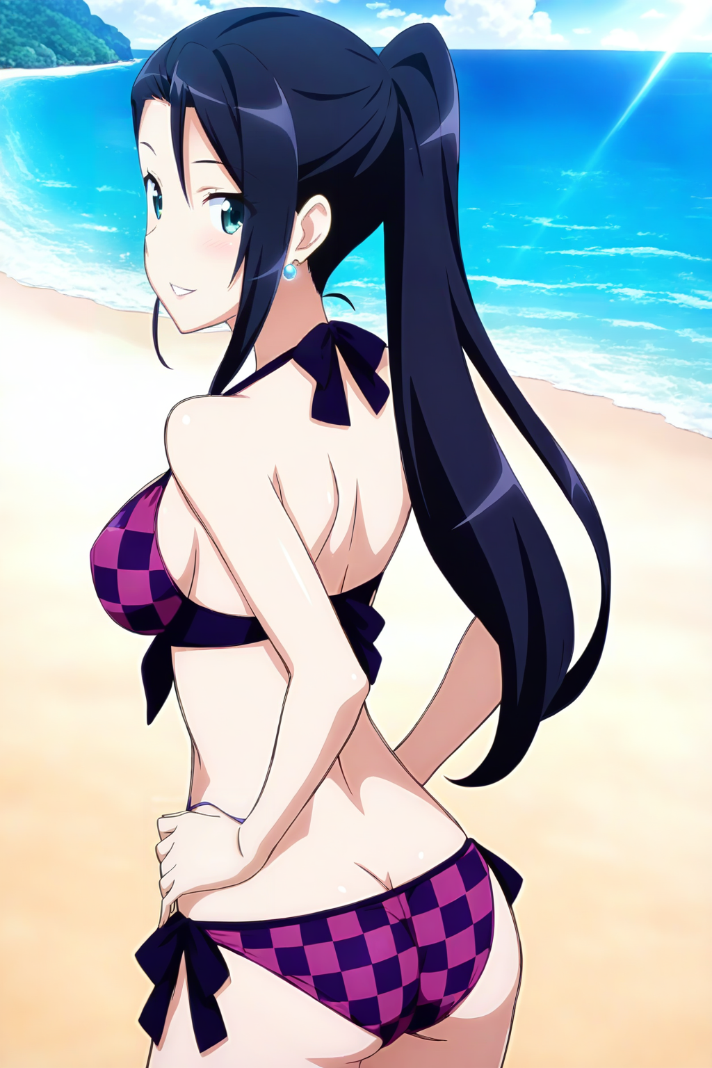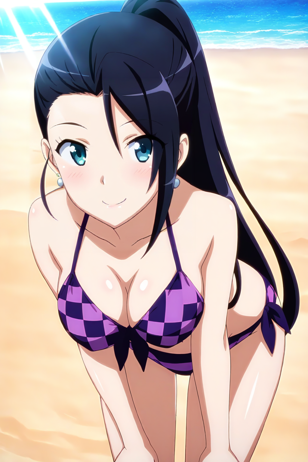 kashima noa, 1girl, solo, black hair, long hair, forehead, asymmetrical bangs, ponytail, aqua eyes, medium breasts, bikini, checkered bikini, purple bikini, front-tie top, side-tie bikini bottom, earrings