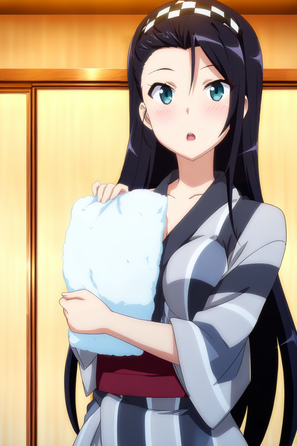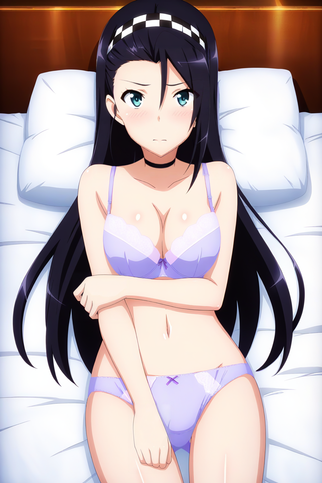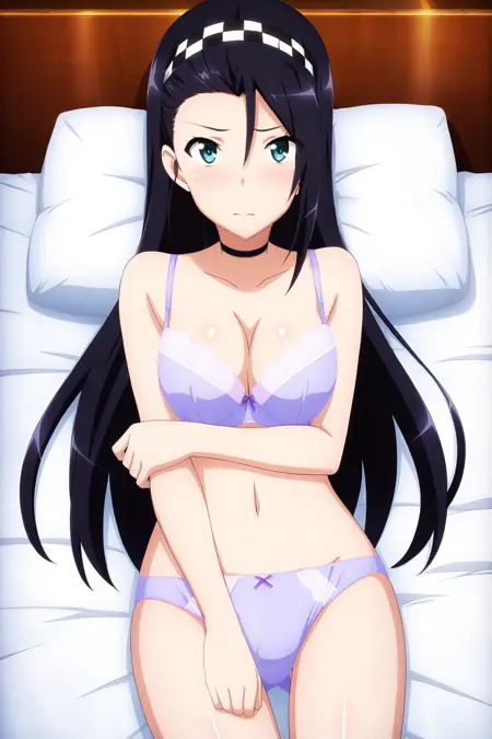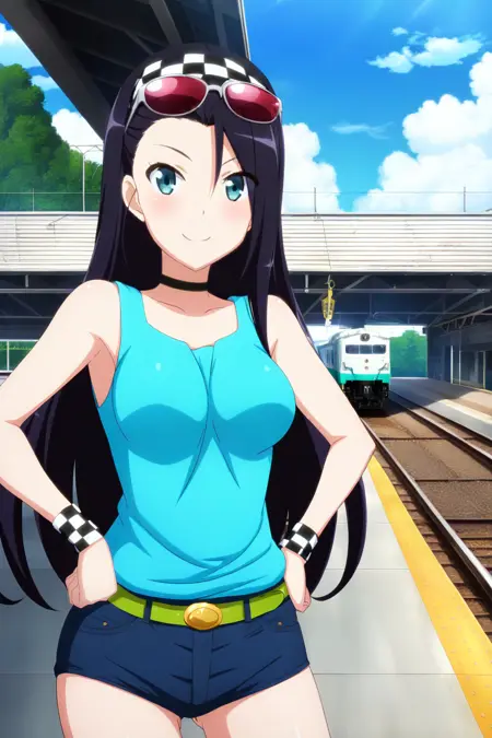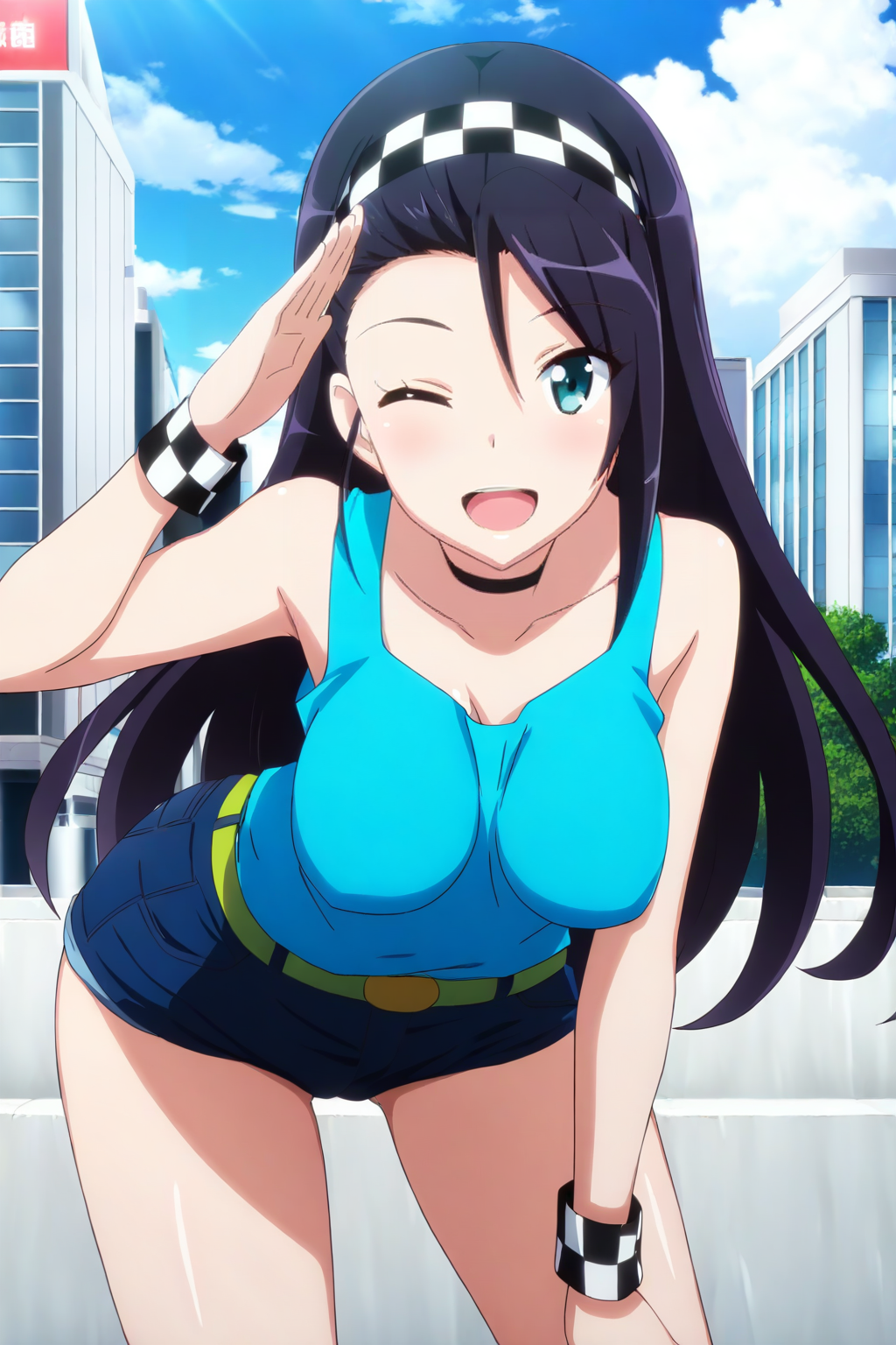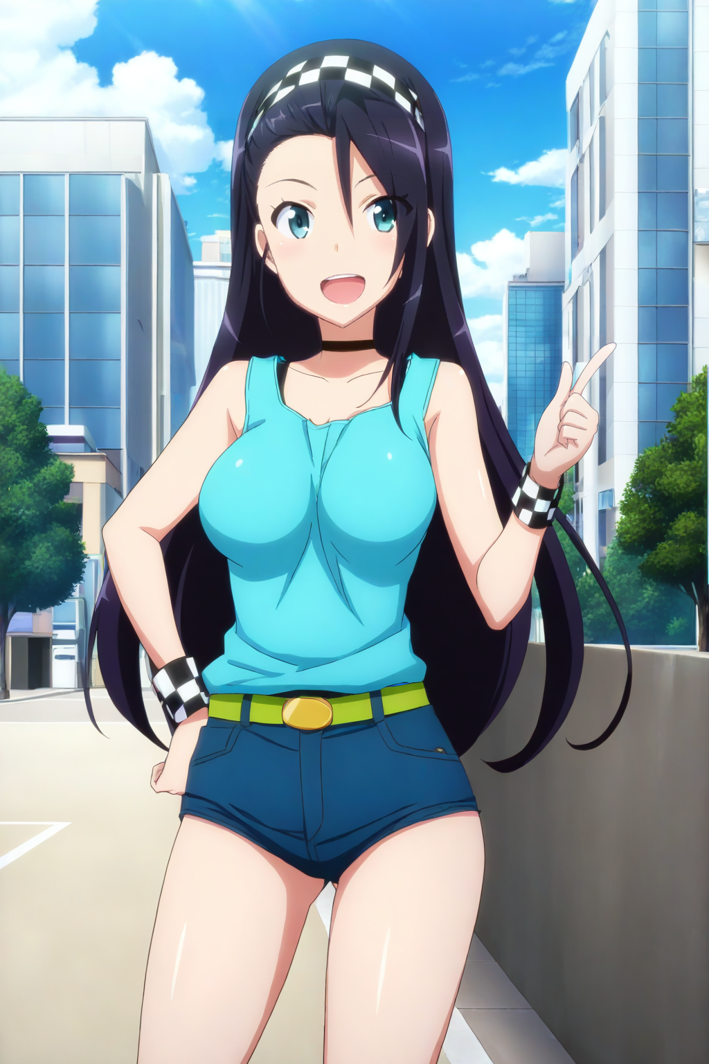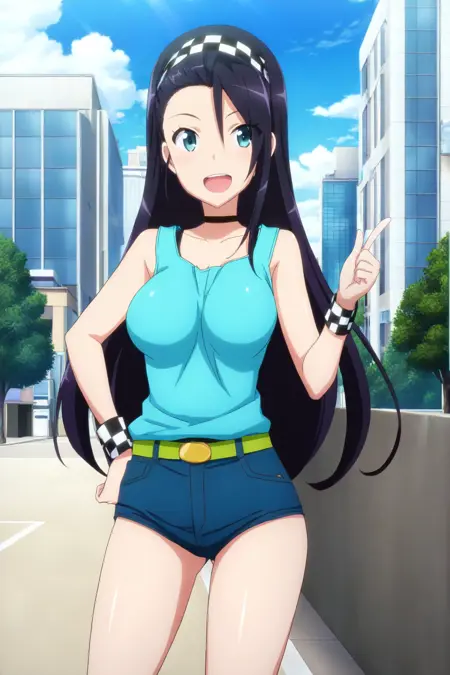 kashima noa, 1girl, solo, black hair, long hair, forehead, asymmetrical bangs, checkered hairband, aqua eyes, medium breasts, aqua tank top, blue shorts, short shorts, green belt, wristband, checkered wristband, black choker