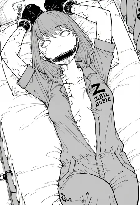 被堵住嘴, 衣服上写有文字, 连体衣, 约束手套, 黑色手套,