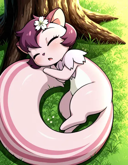 female, chibi, furry, feral, chipmunk, big tail, pink body, partially white body, (purple hair:0.8), flower on head, purple eyes