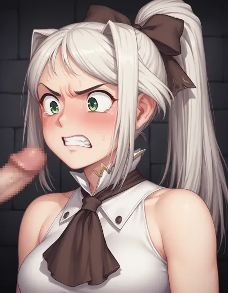 lilia eberwein, white hair, ponytail, sidelocks, hair intakes, hair ribbon, green eyes, sleeveless dress, corset, brown ascot, elbow gloves, white gloves, brown skirt, black thighhighs