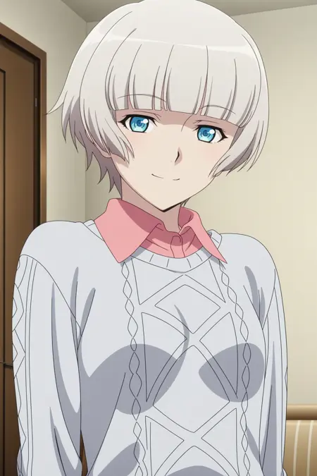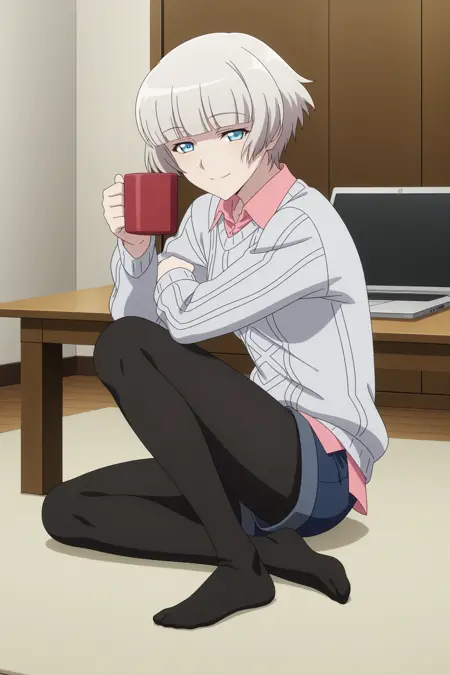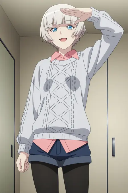 meteora osterreich, white hair, short hair, blunt bangs, blue eyes, long sleeves, pink shirt, collared shirt, untucked shirt, grey sweater, blue shorts, black pantyhose