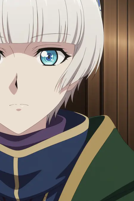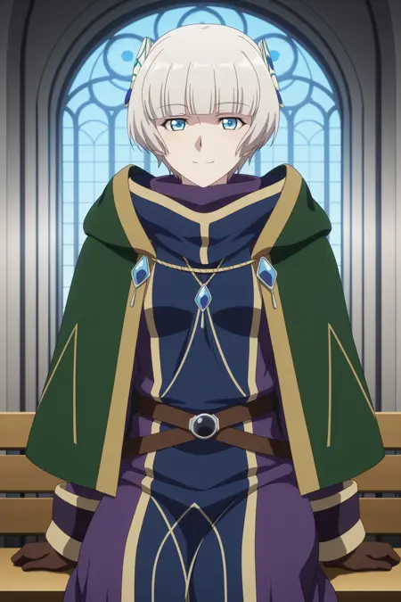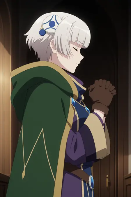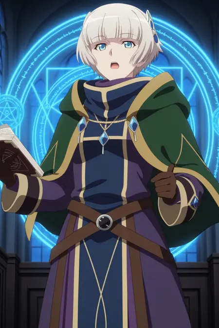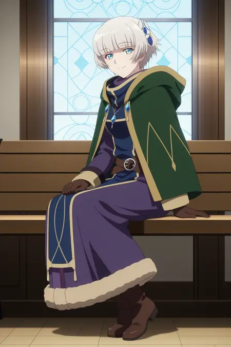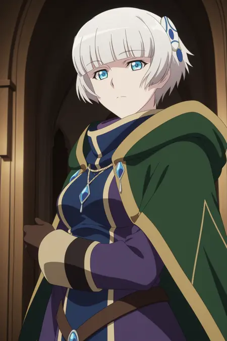 meteora osterreich, white hair, short hair, blunt bangs, hair ornament, blue eyes, long sleeves, robe, hood, green capelet, jewelry, necklace, blue dress, purple dress, long sleeves, brown gloves, brown belt, brown footwear, boots